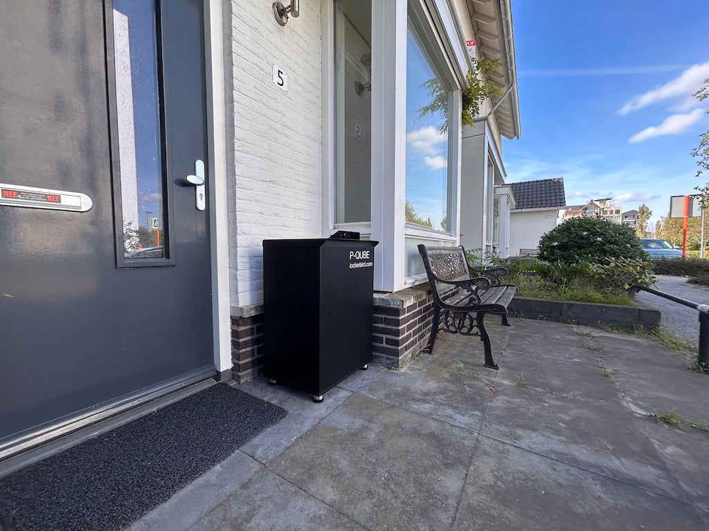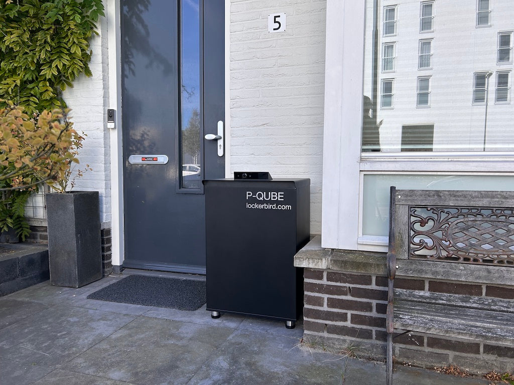 /Introducing the P-QUBE Smart Parcel Delivery Box by Lockerbird, a sleek, black, secure parcel locker designed for modern package delivery. Crafted from durable weather-resistant metal with a matt black finish, it offers protection for your deliveries with style and strength. Featuring a compact cubic design with dimensions 750 mm (height) x 532 mm (width) x 400 mm (depth), it fits conveniently near your entrance or porch.